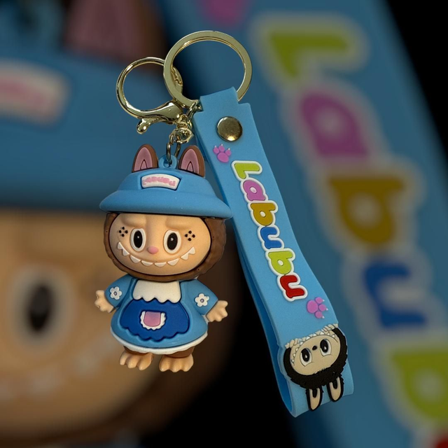 Labubu Sleutelhanger – Pop Mart | Kasing Lung | Siliconen | Bruin met blauwe kleding