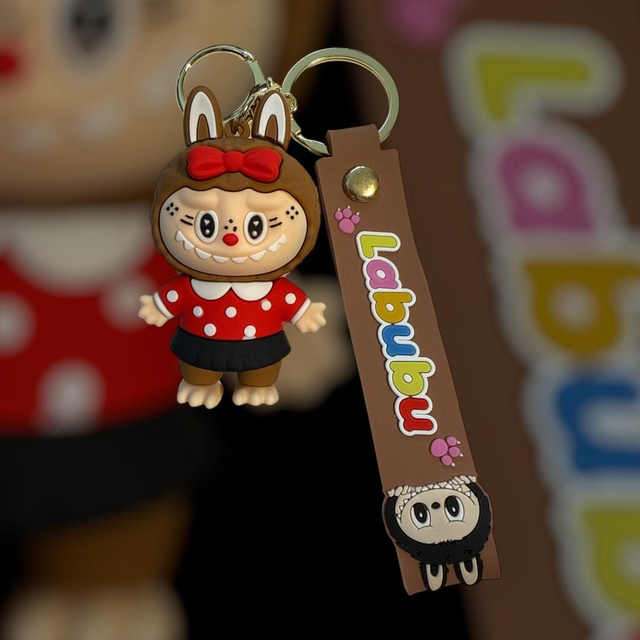 Labubu Sleutelhanger – Pop Mart | Kasing Lung | Siliconen | Bruin met rode strik